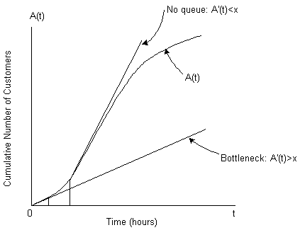 x, there is no queue. At t = ti, when A'(t) > D'(t), a queue